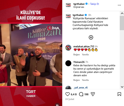 11. AKP’li Cumhurbaşkanı R.T. Erdoğan’ın Atatürk Orman Çiftliği arazisinde yaptırdığı ve resmi cumhurbaşkanlığı makamı olarak “külliye” adıyla kullandığı yerleşkede ramazan ayı boyunca “Külliye’de Ramazan” etkinlikleri kapsamında Celal Karatüre çocuklara, aralarında siyasi iktidar yanlısı basın organları ile sosyal medya hesaplarında propagandası yapılan ve okullarda ders arası zili olarak çalınan “Kâbe’de hacılar hu der” isimli ilahinin de olduğu ilahiler söyledi. (24 Şubat)