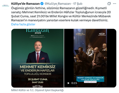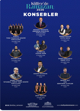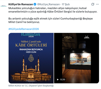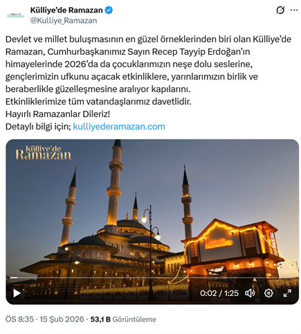17. AKP’li Cumhurbaşkanı R.T. Erdoğan’ın Atatürk Orman Çiftliği arazisinde yaptırdığı ve resmi cumhurbaşkanlığı makamı olarak “külliye” adıyla kullandığı yerleşkede ramazan ayı boyunca “Külliye’de Ramazan” ayı etkinlikleri düzenlendi. Bu faaliyetler için oluşturulan resmi internet sayfası ve sosyal medya hesabı üzerinden duyurlar ve paylaşımlar yapıldı. Resmi sosyal medya hesabından yapılan duyuruda “Devlet ve millet buluşmasının en güzel örneklerinden biri olan Külliye’de Ramazan, Cumhurbaşkanımız Sayın Recep Tayyip Erdoğan’ın himayelerinde 2026’da da çocuklarımızın neşe dolu seslerine, gençlerimizin ufkunu açacak etkinliklere, yarınlarımızın birlik ve beraberlikle güzelleşmesine aralıyor kapılarını. Etkinliklerimize tüm vatandaşlarımız davetlidir. Hayırlı Ramazanlar Dileriz! Detaylı bilgi için; http://kulliyederamazan.com” ifadeleri yer aldı. (28 Şubat)