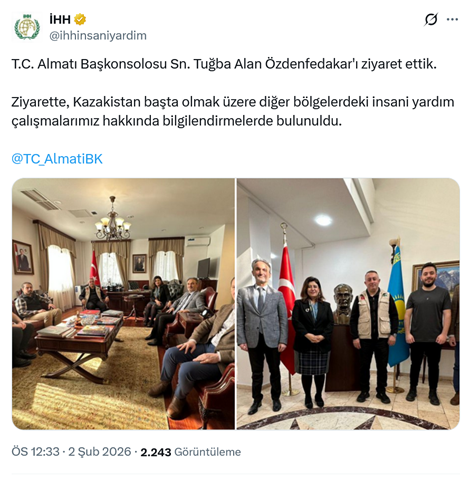 2. Türkiye’nin Kazakistan Almati Başkonsolosu Tuğba Alan Özdenfedakar, İHH heyetini makamında kabul etti. İHH’nın sosyal medya hesabından yapılan paylaşımda, fotoğraflarla birlikte “T.C. Almatı Başkonsolosu Sn. Tuğba Alan Özdenfedakar'ı ziyaret ettik. Ziyarette, Kazakistan başta olmak üzere diğer bölgelerdeki insani yardım çalışmalarımız hakkında bilgilendirmelerde bulunuldu.” ifadeleri yer aldı. (2 Şubat)