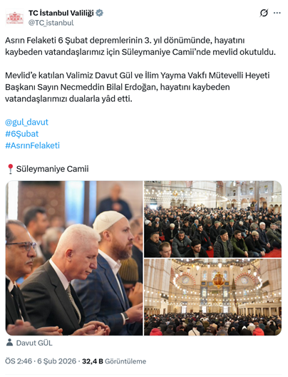 3. İstanbul Valiliği, Vali Davut Gül’ün, AKP’li Cumhurbaşkanı R.T. Erdoğan’ın oğlu Bilal Erdoğan’la birlikte Süleymaniye Camisindeki mevlüde katıldığını resmi sosyal medya hesabında paylaştı. Paylaşımda “Asrın Felaketi 6 Şubat depremlerinin 3. yıl dönümünde, hayatını kaybeden vatandaşlarımız için Süleymaniye Camii’nde mevlid okutuldu. Mevlid’e katılan Valimiz Davut Gül ve İlim Yayma Vakfı Mütevelli Heyeti Başkanı Sayın Necmeddin Bilal Erdoğan, hayatını kaybeden vatandaşlarımızı dualarla yâd etti.” sözleri yer aldı. (6 Şubat)