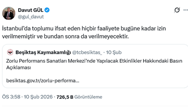 7. İstanbul Valisi Davut Gül, Beşiktaş Kaymakamlığının“Sloughter to Prevail” ve “Behemoth” isimli grupların etkinliklerini yasaklamasına ilişkin sosyal medya hesabından paylaşım yaparak “İstanbul’da toplumu ifsat eden hiçbir faaliyete bugüne kadar izin verilmemiştir ve bundan sonra da verilmeyecektir.” dedi. (10 Şubat)