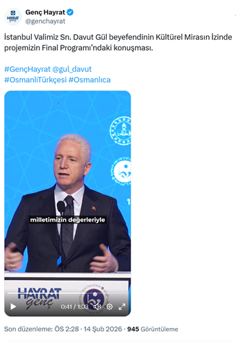 10. İstanbul Valisi Davut Gül, Millî Eğitim Bakanlığı’nın Hayrat Vakfı ile imzaladığı iş birliği protokolü kapsamında “Genç Hayrat” tarafından Cumhurbaşkanlığı Devlet Arşivleri Başkanlığı Osmanlı Arşivi Külliyesi’nde düzenlenen “Kültürel Mirasın İzinde Osmanlı Türkçesi Yarışması” finaline katılarak konuşma yaptı. Gül konuşmasında, Hayrat Vakfına teşekkür ederek “Okullarımızda her alanda dilin öğrenilmesi, köklerimizle bu bağın kurulması çok önemli. Burada Hayrat Vakfı olağanüstü bir iş yapıyor. Bunun yapılabilmesi için ülkenin normalleşmesi lazım. Burada da başta Cumhurbaşkanımız olmak üzere, ona destek veren, Türkiye'mizin normalleşmesine katkı sağlayan herkese teşekkür ediyoruz. Türkiye normalleştikçe, şartlar olgunlaştıkça, milletimizin kökleriyle buluşması, milletimizin değerleriyle buluşması ve bu anlamda ortada engellerin kalkmasıyla daha da hızlanıyor.” dedi. (14 Şubat)