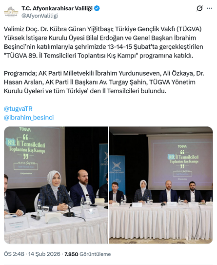 11. Afyonkarahisar Valisi Kübra Güran Yiğitbaşı, AKP’li Cumhurbaşkanı R.T. Erdoğan’ın oğlu Bilal Erdoğan’ın yüksek istişare kurulu başkanı olduğu TÜGVA’nın “89. İl Temsilcileri Toplantısı Kış Kampı” programına katıldı. Vali Güran Yiğitbaşı’nın yanı sıra Bilal Erdoğan, vakıf genel başkanı İbrahim Beşinci ile AKP milletvekilleri katıldığı 3 günlük programın haberi Afyonkarahisar Valiliğinin resmi sosyal medya hesabından “Valimiz Doç. Dr. Kübra Güran Yiğitbaşı; Türkiye Gençlik Vakfı (TÜGVA) Yüksek İstişare Kurulu Üyesi Bilal Erdoğan ve Genel Başkan İbrahim Beşinci’nin katılımlarıyla şehrimizde 13-14-15 Şubat'ta gerçekleştirilen "TÜGVA 89. İl Temsilcileri Toplantısı Kış Kampı" programına katıldı. Programda; AK Parti Milletvekili İbrahim Yurdunuseven, Ali Özkaya, Dr. Hasan Arslan, AK Parti İl Başkanı Av. Turgay Şahin, TÜGVA Yönetim Kurulu Üyeleri ve tüm Türkiye' den İl Temsilcileri bulundu.” Sözleri ve fotoğraflarla paylaşıldı. (14 Şubat)