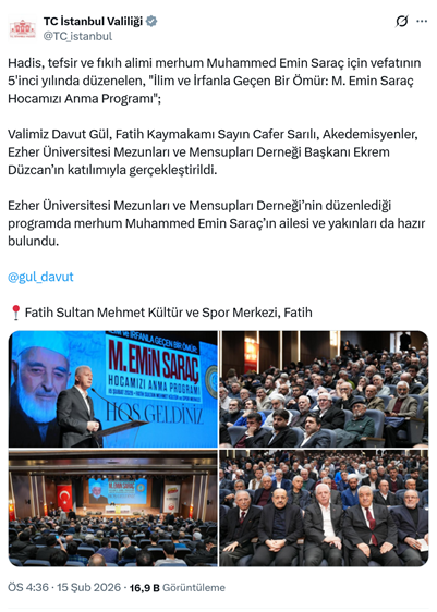 12. İstanbul Valisi Davut Gül ve Fatih Kaymakamı Cafer Sarılı, Nakşibendilerin önemli isimlerinden Cumhuriyet ve Atatürk düşmanı Muhammed Emin Saraç için düzenlenen anma etkinliğine katıldı. Müslüman Kardeşler (İhvan) kadrolarının yetiştirildiği Mısır’daki Ezher Üniversitesinin Türkiye’deki uzantısı olan Ezher Üniversitesi Mezunları ve Mensupları Derneği (Ezder) tarafından düzenlenen etkinliğin haberi İstanbul Valiliğinin resmi sosyal medya hesabından “Hadis, tefsir ve fıkıh alimi merhum Muhammed Emin Saraç için vefatının 5'inci yılında düzenelen, "İlim ve İrfanla Geçen Bir Ömür: M. Emin Saraç Hocamızı Anma Programı"; Valimiz Davut Gül, Fatih Kaymakamı Sayın Cafer Sarılı, Akedemisyenler, Ezher Üniversitesi Mezunları ve Mensupları Derneği Başkanı Ekrem Düzcan’ın katılımıyla gerçekleştirildi. Ezher Üniversitesi Mezunları ve Mensupları Derneği’nin düzenlediği programda merhum Muhammed Emin Saraç’ın ailesi ve yakınları da hazır bulundu.” ifadeleri ve fotoğraflarla paylaşıldı. AKP'li Cumhurbaşkanı R.T. Erdoğan, 2014'te imam hatipten hocası Prof. Dr. Osman Öztürk'ün cenazesinde, namazı kıldıran Saraç'ın namaz sonrası elini öpmüş, 2021 yılında ölümünün ardından da yayınladığı taziye mesajında, "Ömrünün her safhasında rızayı ilâhî için gösterdiği büyük gayretlere şahitlik ettiğimiz, çok kıymetli İslâm âlimi Muhammed Emin Saraç hocamıza Cenab-ı Allah’tan rahmet niyaz ediyorum. Muhterem hocamızın mekânı cennet, makamı âlî olsun" ifadelerine yer vermişti. Muhammed Emin Saraç, Menemen isyanını destekledikleri için yargılanan ve 6 ay hapis cezası alan Nakşibendi Üzeyir Efendi’nin torunu ve Mustafa Efendi’nin oğlu ve El Kaide’nin finansörü Yasin El Kadı’nın ortağı olan Mehmet Fatih Saraç ile 2014-2021 yılları arasında YÖK Başkanı olan Yekta Saraç’ın babasıdır. (15 Şubat)