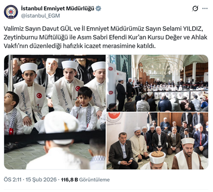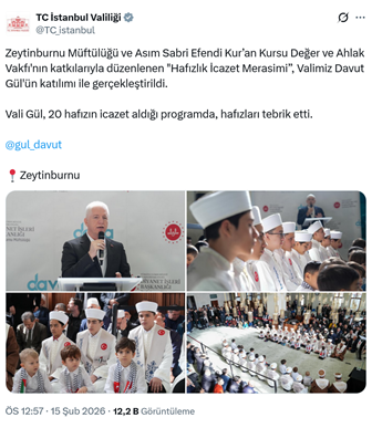 13. İstanbul Valisi Davut Gül ve İl Emniyet Müdürü Selami Yıldız, Saidi Nursi taraftarı Nurcu Hamidiye Vakfıyla bağlantılı Asım Sabri Efendi Kur’an Kursu Değer ve Ahlak Vakfı ile Zeytinburnu Müftülüğünün düzenlediği hafızlık icazet merasimine katıldı. Vali Gül’ün konuşma yaptığı program Valiliğin ve Emniyet Müdürlüğünün resmi sosyal medya hesaplarından paylaşıldı. (15 Şubat)