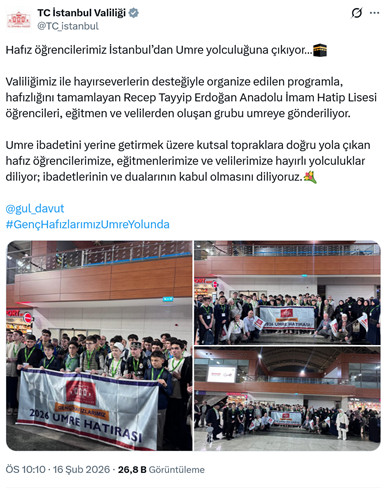 14. İstanbul Valiliği’nin düzenlediği, “Genç Hafızlarımız Umre Yolunda” programıyla umreye giden öğrenciler valilik tarafından uğurlandı. İstanbul Valiliği’nin resmi sosyal medya hesabından yapılan paylaşımda “Hafız öğrencilerimiz İstanbul’dan Umre yolculuğuna çıkıyor… Valiliğimiz ile hayırseverlerin desteğiyle organize edilen programla, hafızlığını tamamlayan Recep Tayyip Erdoğan Anadolu İmam Hatip Lisesi öğrencileri, eğitmen ve velilerden oluşan grubu umreye gönderiliyor. Umre ibadetini yerine getirmek üzere kutsal topraklara doğru yola çıkan hafız öğrencilerimize, eğitmenlerimize ve velilerimize hayırlı yolculuklar diliyor; ibadetlerinin ve dualarının kabul olmasını diliyoruz.” dendi. (16 Şubat)