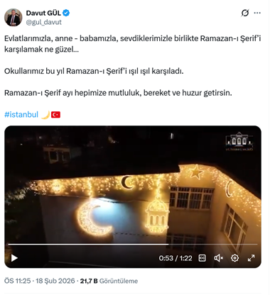 15. İstanbul Valisi Davut Gül, sosyal medya hesabından, farklı okulların Ramazan ışıklandırmalarının yer aldığı bir video ile birlikte “Evlatlarımızla, anne - babamızla, sevdiklerimizle birlikte Ramazan-ı Şerif’i karşılamak ne güzel… Okullarımız bu yıl Ramazan-ı Şerif’i ışıl ışıl karşıladı. Ramazan-ı Şerif ayı hepimize mutluluk, bereket ve huzur getirsin.” ifadelerini paylaştı. (18 Şubat)