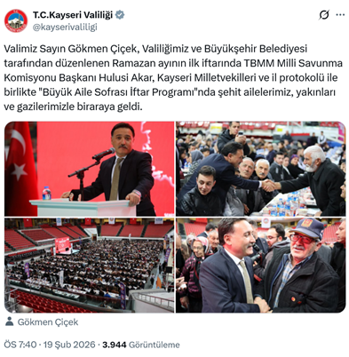 16. Kayseri Valiliği, AKP’li Büyükşehir Belediyesi ile birlikte Kadir Has Kongre ve Spor Merkezi’nde “Büyük Aile Sofrası” adıyla iftar programı düzenledi. Kuran tilavetinin yer aldığı programa Vali Gökmen Çiçek, AKP’li TBMM Milli Savunma Komisyonu Başkanı Hulusi Akar, CHP Kayseri Milletvekili Aşkın Genç ve AKP’li Büyükşehir Belediye Başkanı Memduh Büyükkılıç ile il protokolü katıldı. Programla ilgili haber valiliğin resmi sosyal medya hesabından paylaşıldı. (19 Şubat)