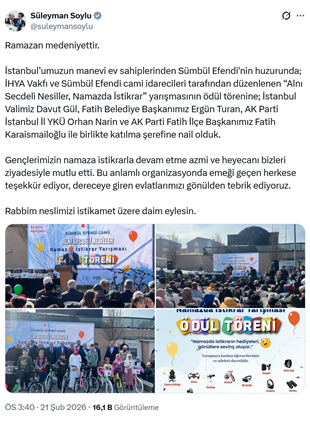 17. AKP’li İstanbul milletvekili ve eski İçişleri Bakanı Süleyman Soylu, sosyal medya hesabından yaptığı paylaşımda İstanbul Valisi Davut Gül ile birlikte İsmailağa cemaatine bağlı İHYA Vakfı ve Sümbül Efendi camisinin düzenlediği “Alnı Secdeli Nesiller, Namazda İstikrar” yarışmasının ödül törenine katıldığını duyurdu. Soylu paylaşımında “Ramazan medeniyettir. İstanbul’umuzun manevi ev sahiplerinden Sümbül Efendi'nin huzurunda; İHYA Vakfı ve Sümbül Efendi cami idarecileri tarafından düzenlenen “Alnı Secdeli Nesiller, Namazda İstikrar” yarışmasının ödül törenine; İstanbul Valimiz Davut Gül, Fatih Belediye Başkanımız Ergün Turan, AK Parti İstanbul İl YKÜ Orhan Narin ve AK Parti Fatih İlçe Başkanımız Fatih Karaismailoğlu ile birlikte katılma şerefine nail olduk. Gençlerimizin namaza istikrarla devam etme azmi ve heyecanı bizleri ziyadesiyle mutlu etti. Bu anlamlı organizasyonda emeği geçen herkese teşekkür ediyor, dereceye giren evlatlarımızı gönülden tebrik ediyoruz. Rabbim neslimizi istikamet üzere daim eylesin.” ifadeleriyle birlikte fotoğraflar paylaştı. (21 Şubat)