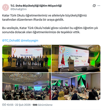 18. Türkiye’nin Doha Büyükelçiliği, Katar Türk Okulu ile birlikte iftar programı düzenledi. Büyükelçiliğin Eğitim Müşavirliği’nin resmi sosyal medya hesabından programla ilgili olarak “Katar Türk Okulu öğretmenlerimiz ve aileleriyle büyükelçiliğimiz tarafından düzenlenen iftarda bir araya geldik. Bu vesileyle, Katar Türk Okulu’ndaki görev süreleri bu eğitim öğretim yılı sonunda dolacak olan öğretmenlerimize de teşekkür ettik.” ifadeleriyle birlikte fotoğraflar paylaşıldı. (22 Şubat)