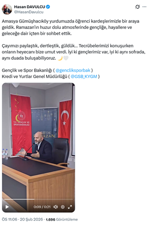 1. RTÜK Üyesi Hasan Davulcu, sosyal medya hesabından yaptığı paylaşımda Amasya Gümüşhacıköy’de KYK’ya bağlı bir yurtta katıldığı Ramazan programını videoyla paylaştı. Davulcu paylaşımında “Amasya Gümüşhacıköy yurdumuzda öğrenci kardeşlerimizle bir araya geldik. Ramazan’ın huzur dolu atmosferinde gençliğe, hayallere ve geleceğe dair içten bir sohbet ettik.