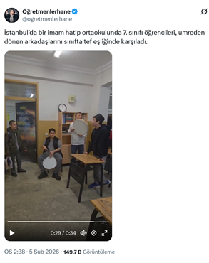 1. Sosyal medyada Öğretmenhane isimli bir hesap “İstanbul’da bir imam hatip ortaokulunda 7. sınıfı öğrencileri, umreden dönen arkadaşlarını sınıfta tef eşliğinde karşıladı.” sözleriyle video paylaştı. Videoda 7. Sınıf öğrencilerin def eşliğinde ilahiler söylediği görüldü. (5 Şubat)