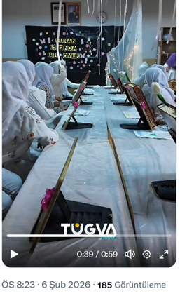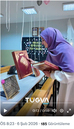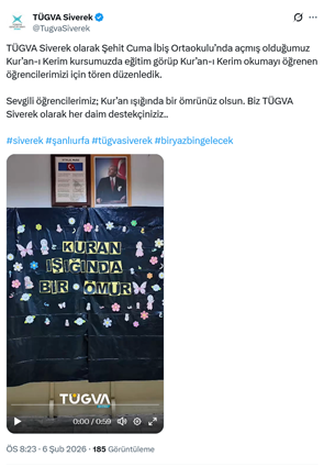 3. AKP’li Cumhurbaşkanı R.T. Erdoğan’ın oğlu Bilal Erdoğan’ın yüksek istişare kurulu başkanı olduğu TÜGVA’nın Siverek şubesi sosyal medya hesabından, Şehit Cuma İbiş Ortaokulu’nda açtığı Kuran kursuyla ilgili videolu paylaşım yaptı. Paylaşımda “TÜGVA Siverek olarak Şehit Cuma İbiş Ortaokulu’nda açmış olduğumuz Kur’an-ı Kerim kursumuzda eğitim görüp Kur’an-ı Kerim okumayı öğrenen öğrencilerimizi için tören düzenledik. Sevgili öğrencilerimiz; Kur’an ışığında bir ömrünüz olsun. Biz TÜGVA Siverek olarak her daim destekçiniziz.” ifadeleri ile tesettürlü kız öğrencilerin görüntüleri yer aldı. (6 Şubat)
