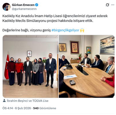 4. AKP’li Cumhurbaşkanı R.T. Erdoğan’ın oğlu Bilal Erdoğan’ın yüksek istişare kurulu başkanı olduğu TÜGVA, İstanbul’da Kadıköy Kız Anadolu İmam Hatip Lisesini ziyaret etti. Vakfın başkan yardımcısı ve lise koordinatörü ünvanlı Gürkan Emecen ziyareti sosyal medya hesabından “Kadıköy Kız Anadolu İmam Hatip Lisesi öğrencilerimizi ziyaret ederek Kadıköy Meclis Simülasyonu projesi hakkında istişare ettik. Değerlerine bağlı, vizyonu geniş #birgençlikgeliyor” sözleriyle paylaştı. (6 Şubat)