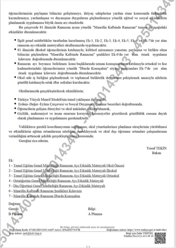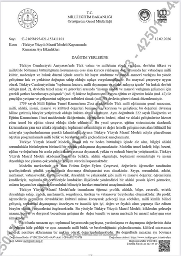 5. Milli Eğitim Bakanlığı’nın 81 ile gönderdiği yazıyla ramazan ayı boyunca “Maarifin Kalbinde Ramazan” etkinlikleri düzenleneceği duyuruldu. Bakanlık yazısında, Türkiye Yüzyılı Maarif Modeli kapsamında “milli ve manevi değerleri geliştirmeye yönelik eğitsel ve sosyal etkinlikler yapılacağı” belirtilirken iftar programları ve söyleşiler planlandığı açıklandı. Yazıda, anayasa ve Milli Eğitim Temel Kanunu’na atıf yapılarak eğitimin “ahlaki olgunluğu ve değer temelli gelişimi” esas alan bütüncül bir anlayışla yürütülmesi gerektiği söylendi. Planlanan faaliyetler “İlkokullarda Şenlik Havası: 81 ilde ilkokul öğrencilerine yönelik kültürel mirası yansıtan Ramazan şenlikleri düzenlenecek. Ortaokul ve Liselerde Söyleşi: Uzman konuşmacıların katılımıyla "İftarda Konuşalım" başlıklı programlar gerçekleştirilecek. Gönüllü İftar Sofraları: Okul-aile iş birliğini güçlendirmek amacıyla velilerin gönüllü katılımıyla ortak iftar sofraları kurulacak. Özel Eğitim Materyalleri: Okul öncesinden liseye kadar tüm kademeler için hazırlanan Ramazan ayı etkinlik materyalleri derslerde kullanılacak.” şeklinde sıralandı. (12 Şubat)