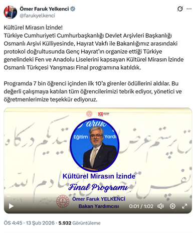 7. Millî Eğitim Bakanlığı’nın Hayrat Vakfı ile imzaladığı iş birliği protokolü kapsamında “Genç Hayrat” tarafından düzenlenen “Kültürel Mirasın İzinde Osmanlı Türkçesi Yarışması” finali, Cumhurbaşkanlığı Devlet Arşivleri Başkanlığı Osmanlı Arşivi Külliyesi’nde yapıldı. Türkiye genelindeki 505 Fen ve Anadolu Lisesinden öğrencilerle düzenlenen programa AKP’li Cumhurbaşkanı R.T. Erdoğan’ın oğlu Bilal Erdoğan İlim Yayma Cemiyeti Mütevelli Heyeti Başkanı sıfatıyla katılarak konuşma yaptı. Bilal Erdoğan yaptığı konuşmada “Osmanlı Türkçesi veya Osmanlıca okumanın gençlerimiz tarafından öğrenilmesi hakikaten şimdi bize bu kadar doğal geliyor. Ama daha yakın zamanlarda, daha 10 - 15 sene önce Türkiye’de bunlar büyük tabuydu. Birisi kalkıp ‘eski harflerle yazılan metinleri ben okuyamıyorum, okumak istiyorum, bununla ilgili bir eğitim alayım’ dese, bu bir sorun teşkil ediyordu. Bununla ilgili birileri hemen itirazlarını seslendiriyorlardı ama şimdi normalleşti. Bu bizim kendi dilimiz, kendi metinlerimiz, kendi geçmişimiz, kendi tarihimiz. Burada birinciye aile yakınıyla beraber Umre ödülü verilecekmiş. Onu da ikinciyle üçüncüyü de dâhil edecek şekilde genişletildiğinin de müjdesini veriyorum. Hayırlı uğurlu olsun.” ifadelerini kullandı. Milli Eğitim Bakan Yardımcısı Ömer Faruk Yelkenci de konuşmasında “Dil, kültür unsurlarını yarınlara, istikbale taşımanın yegâne vasıtasıdır. Dolayısıyla bunu ne kadar güçlü tutarsak, Türkistan'dan Balkanlar'a bunun izlerini ne kadar güçlü bir şekilde bırakabilirsek, millet olarak istikbalde, yarınlarda o kadar güçlü bir şekilde var olabiliriz. Göktürk abidelerinden Selimiye Camisi'ne, bugün üretilen bütün eserlere kadar kültür varlığımı bizim için kesintisiz bir şekilde devam etmektedir. Ancak bunu kesintiye uğratma girişimleri milletimizin ferasetiyle her defasında başarısız olmaktadır. Osmanlıca öğrenmek diye bir şeyden bahsetmemek lazım. Çünkü Osmanlıca dediğimiz şey Türkçedir, çocuklarımıza bunu özellikle belletmek gerekir.” ifadelerini kullandı. Gençlik ve Spor Bakan Yardımcısı Enes Eminoğlu da konuşmasında “1966'da başlayan, bugüne kadar ara ara kesintiye uğrasa da, günümüzde milyonlarca kişiye Osmanlıca eğitimi verilen bir noktaya gelmiş durumdayız. Bu çok kıymetli. Bunlar daha da ileriye taşınacaktır. Okullarda, Gençlik ve Spor Bakanlığı olarak gençlik merkezlerimizde, yine gençlik kamplarında da bu eğitimlerimiz aralıksız devam ediyor. Bundan sonraki süreçte de üniversite topluluklarımızla, sivil toplum kuruluşlarımızla, derneklerimizle, vakıflarımızla bu çalışmaları daha ileriye taşımak için elimizden gelen mücadeleyi ortaya koyacağız.” dedi. DHA’nın haberine göre; programa İstanbul Valisi Davut Gül, Milli Eğitim Bakan Yardımcısı Ömer Faruk Yelkenci, Gençlik ve Spor Bakan Yardımcısı Enes Eminoğlu, Kâğıthane Kaymakamı Yüksel Kara, AKP’li Kâğıthane Belediye Başkanı Mevlüt Öztekin katıldı. (12 Şubat)