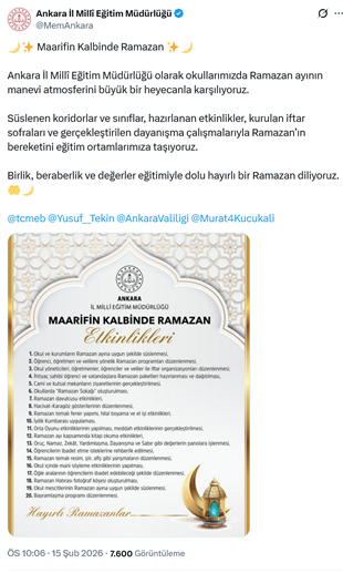 10. Ankara İl Milli Eğitim Mürdürlüğü, resmi internet sitesinden “Maarifin Kalbinde Ramazan” etkinlikler görseli paylaştı. Paylaşım, “Maarifin Kalbinde Ramazan Ankara İl Millî Eğitim Müdürlüğü olarak okullarımızda Ramazan ayının manevi atmosferini büyük bir heyecanla karşılıyoruz. Süslenen koridorlar ve sınıflar, hazırlanan etkinlikler, kurulan iftar sofraları ve gerçekleştirilen dayanışma çalışmalarıyla Ramazan’ın bereketini eğitim ortamlarımıza taşıyoruz. Birlik, beraberlik ve değerler eğitimiyle dolu hayırlı bir Ramazan diliyoruz.” sözleriyle yapıldı. (15 Şubat)