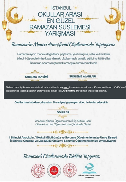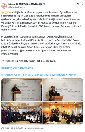 34. İstanbul İl Milli Eğitim Müdürlüğü’nün resmi sosyal medya hesabından İstanbul Valiliğinin “Ramazan Ayı Işıklandırma Faaliyetlerine İlişkin Genelge” kapsamında, İl Milli Eğitim Müdürü Murat Mücahit Yentür, Vali Davut Gül, Fatih Kaymakamı Cafer Sarılı, Ziraat Katılım Genel Müdürü Metin Özdemir, Albayrak Medya Genel Müdürü Abdullah Hanönü, ÖNDER Genel Başkanı Abdullah Ceylan ile il ve ilçe eğitim yöneticilerinin katıldığı, Fatih Neslişah Kız Anadolu İmam Hatip Lisesinde yapılan proje tanıtım toplantısı paylaşıldı. Paylaşımda, “Valiliğimiz tarafından yayınlanan Ramazan Ayı Işıklandırma Faaliyetlerine İlişkin Genelge doğrultusunda ilimizde yürütülen ışıklandırma çalışmaları kapsamında; Müdürlüğümüzün koordinasyonu ve Ziraat Katılım Bankası, Albayrak Medya ve Önder İmam Hatipliler Derneği’nin katkıları ile ilimizdeki 886 lisenin tamamı Ramazan ışıkları ile aydınlatılıyor. Projenin tanıtım toplantısı; Valimiz Sayın Davut Gül, İl Millî Eğitim Müdürümüz Murat Mücahit Yentür, Ziraat Katılım Genel Müdürü Sayın Metin Özdemir, Albayrak Medya Genel Müdürü Sayın Abdullah Hanönü, ÖNDER Genel Başkanı Sayın Abdullah Ceylan, il ve ilçe eğitim yöneticilerimiz, öğretmenlerimiz ve öğrencilerimizin katılımı ile gerçekleştirildi.” ifadeleriyle birlikte fotoğraflar yer aldı. (19 Şubat)