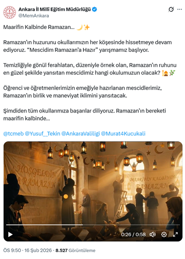 15. Ankara İl Milli Eğitim Müdürlüğü, MEB’in “Maarifin Kalbinde Ramazan” projesi kapsamında, okullarda “Mescidim Ramazan’a Hazır” yarışması düzenledi. Müdürlüğün resmi sosyal medya hesabından yapılan videolu paylaşımda “Maarifin Kalbinde Ramazan… Ramazan’ın huzurunu okullarımızın her köşesinde hissetmeye devam ediyoruz. “Mescidim Ramazan’a Hazır” yarışmamız başlıyor. Temizliğiyle gönül ferahlatan, düzeniyle örnek olan, Ramazan’ın ruhunu en güzel şekilde yansıtan mescidimiz hangi okulumuzun olacak? Öğrenci ve öğretmenlerimizin emeğiyle hazırlanan mescidlerimiz, Ramazan’ın birlik ve maneviyat iklimini yansıtacak. Şimdiden tüm okullarımıza başarılar diliyoruz. Ramazan’ın bereketi maarifin kalbinde…” dendi. (16 Şubat)