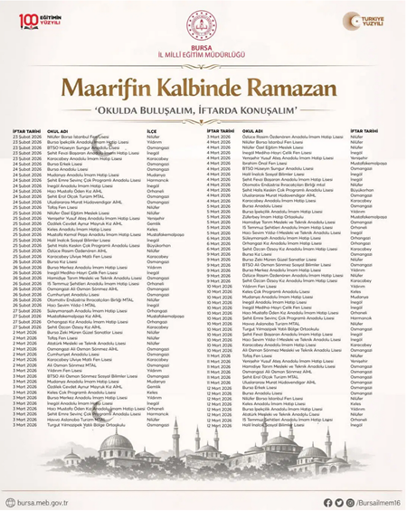 32. AKP’li Milli Eğitim Bakanı Yusuf Tekin’in imzasıyla 81 il valiliğine gönderdiği yazıyla, ramazan ayı boyunca okullarda “Maarifin Kalbinde Ramazan” temalı etkinlikler düzenleneceğini bildirmesinin ardından Bursa İl Milli Eğitim Müdürlüğü’nün açıkladığı programla kent genelinde toplamda 170 okulun bu kapsama alındığı kaydedildi. Özellikle Osmangazi (41) ve Nilüfer (32) ilçelerindeki yoğunluk dikkat çekerken; Yıldırım, İnegöl ve Karacabey gibi ilçelerin de yoğun biçimde iftar etkinlerinin gerçekleşeceği bildirildi. (19 Şubat)