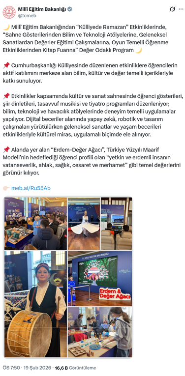33. Millî Eğitim Bakanlığı’nın resmi sosyal medya hesabından, ““Külliyede Ramazan” Etkinliklerinde, “Sahne Gösterilerinden Bilim ve Teknoloji Atölyelerine, Geleneksel Sanatlardan Değerler Eğitimi Çalışmalarına, Oyun Temelli Öğrenme Etkinliklerinden Kitap Fuarına” Değer Odaklı Program” paylaşıldı. Paylaşımda, Cumhurbaşkanlığı Külliyesinde düzenlenen etkinliklere öğrencilerin aktif katılımını merkeze alan bilim, kültür ve değer temelli içerikleriyle katkı sunuluyor. Etkinlikler kapsamında kültür ve sanat sahnesinde öğrenci gösterileri, şiir dinletileri, tasavvuf musikisi ve tiyatro programları düzenleniyor; bilim, teknoloji ve havacılık atölyelerinde deneyim temelli uygulamalar yapılıyor. Dijital beceriler alanında yapay zekâ, robotik ve tasarım çalışmaları yürütülürken geleneksel sanatlar ve yaşam becerileri etkinlikleriyle kültürel miras, uygulamalı biçimde ele alınıyor. Alanda yer alan “Erdem-Değer Ağacı”, Türkiye Yüzyılı Maarif Modeli’nin hedeflediği öğrenci profili olan “yetkin ve erdemli insanın vatanseverlik, ahlak, sağlık, cesaret ve merhamet” gibi temel değerlerini görünür kılıyor.” dendi. (19 Şubat)