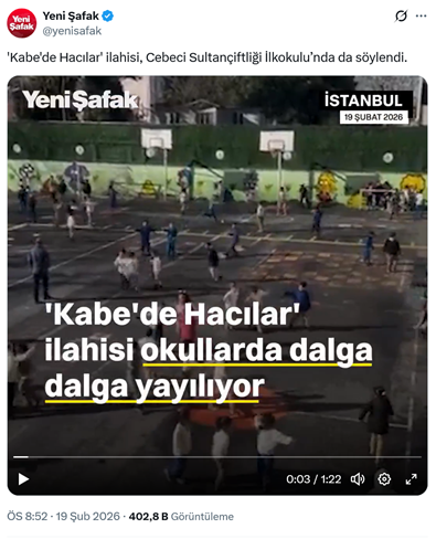 35. İstanbul Sultangazi’de bulunan Cebeci Sultançiftliği İlkokulunda ders arasında “Kâbe’de hacılar” ilahisinin çalındığı ortaya çıktı. Siyasi iktidara yakın Yeni Şafak, sosyal medya hesabından okulda çalınan ilahiyi “'Kâbe’de Hacılar' ilahisi, Cebeci Sultançiftliği İlkokulu’nda da söylendi” sözleriyle video ile birlikte paylaştı. (19 Şubat)
