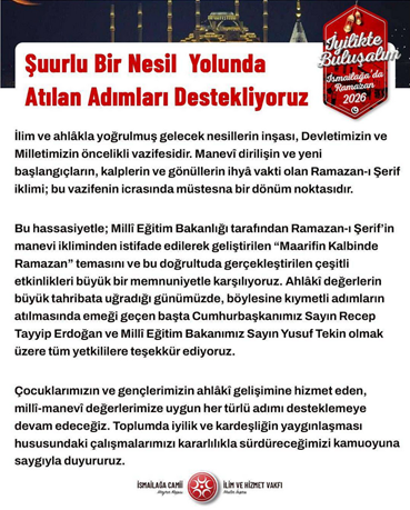 46. Milli Eğitim Bakanlığı’nın “Ramazan Genelgesi”ne İsmailağa Cemaatinden destek açıklaması geldi. “Şuurlu bir nesil yolunda atılan adımları destekliyoruz.” Başlıklı açıklamada “İlim ve ahlâkla yoğrulmuş gelecek nesillerin inşası, Devletimizin ve Milletimizin öncelikli vazifesidir. Manevî dirilişin ve yeni başlangıçların, kalplerin ve gönüllerin ihyâ vakti olan Ramazan-ı Şerif iklimi; bu vazifenin icrasında müstesna bir dönüm noktasıdır. Bu hassasiyetle; Millî Eğitim Bakanlığı tarafından Ramazan-ı Şerif’in manevi ikliminden istifade edilerek geliştirilen *“Maarif’in Kalbinde Ramazan”* temasını ve bu doğrultuda gerçekleştirilen çeşitli etkinlikleri büyük bir memnuniyetle karşılıyoruz. Ahlâkî değerlerin büyük tahribata uğradığı günümüzde, böylesine kıymetli adımların atılmasında emeği geçen başta Cumhurbaşkanımız Sayın Recep Tayyip Erdoğan ve Millî Eğitim Bakanımız Sayın Yusuf Tekin olmak üzere tüm yetkililere teşekkür ediyoruz. Çocuklarımızın ve gençlerimizin ahlâkî gelişimine hizmet eden, millî-manevî değerlerimize uygun her türlü adımı desteklemeye devam edeceğiz. Toplumda iyilik ve kardeşliğin yaygınlaşması hususundaki çalışmalarımızı kararlılıkla sürdüreceğimizi kamuoyuna saygıyla duyururuz.” dendi. (24 Şubat)
