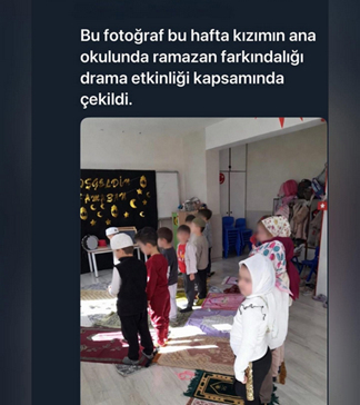 53. İstanbul Esenler’de bulunan Esenler Kazım Karabekir İlkokulu’nda ikinci sınıfa giden bir öğrencinin velisi Millî Eğitim Bakanlığı’nın “Maarif’in Kalbinde Ramazan” genelgesi sonrası düzenlenen etkinlikler kapsamında ikinci sınıfa giden çocuğunun başına namaz başörtüsü takılarak fotoğrafının çekildiğini söyledi. Kısa Dalga’dan Gülseven Özkan'ın haberine göre, güvenliği nedeniyle adının açıklanmasını istemeyen veli, Alevi inancına mensup olduğunu belirterek çocuğunun başına namaz başörtüsü takıldığını, eline Yasin verildiğini ve tüm bunların kendisinden habersiz yapıldığını belirtti. “Geçen gün WhatsApp grubuna girdim. Birden bire resimleri görünce şok oldum. Kız çocuklarının kafasına namaz başörtüsü takmışlar. Ellerine de Yasin vermişler. Bir köşe oluşturmuşlar, ‘Hoş geldin Ya Şehr-i Ramazan’ yazmışlar. Erkeklere de takke takmışlar. Bütün sınıfa yapmışlar.” dedi. Uygulamanın ikinci sınıf öğrencilerine yönelik yapıldığını belirten veli, öğretmene mesaj yazmayı düşündüğünü ancak aralarında daha önce yaşanan sorunlar nedeniyle vazgeçtiğini söyledi. Ayrıca 50 lira karşılığında Ramazan takvimi dağıtıldığını belirten veli, “Kazımalı bir etkinlik takvimiymiş, ben bu takvimi istemiyorum, dedim. Geri gönderdim” dedi. Sınıftaki uygulamaların çocuğu üzerinde etkisi olduğunu söyleyen veli, “Çocuk eve geliyor, ‘Anne, ben yarın oruç tutacağım’ diyor. Sabah kalkıyor, ‘Anne, ben bugün oruç tutayım’ diyor. Sonra ‘Anne ben acıkırım ya’ diyor. Sonra kararını değiştiriyor. ‘Anne, tamam, ben kahvaltı yapayım’ diyor. Çocuğun kafasını böyle karıştırıyorlar” dedi. Sınıftaki bazı çocukların “Sen niye oruç tutmuyorsun?” diye sorduğunu da aktaran veli, bunun çocuklar üzerinde dolaylı bir baskı oluşturduğunu ifade etti. (27 Şubat)