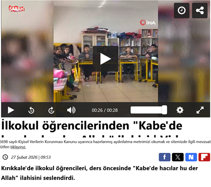 52. Kırıkkale Özel Gazi Kolejinde Din Kültürü ve Ahlak Bilgisi öğretmeni Büşra Sezer, ilkokul öğrencilerine ders öncesi "Kâbe’de hacılar hu der Allah" ilahisini söyletti. (27 Şubat)