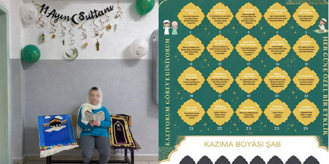 16. Milli Eğitim Bakanlığı'nın 81 ile gönderdiği “Ramazan Ayı Etkinlikleri” genelgesinin ardından, öğrencilere, “Oruç, namaz, sadaka, teravih” ve “Salavat-ı Şerife” ile “Kelime-i Tevhid” kutucuklarının yer aldığı, “Ramazan Çetelesi” dağıtıldığı, okul müdürlerine ise “Öğle aralarının ibadet saatlerine göre düzenlenmesi” talimatı verildiği öğrenildi. BirGün’den Mustafa Bildircin’in haberine göre, AKP’li Tekin’in talimatının ardından bazı il milli eğitim müdürlükleri ve okul müdürleri, “Hız kesmeden” harekete geçti. Ankara İl Milli Eğitim Müdürlüğü’nce okullara gönderilen, “Ramazan Ayı Etkinlikleri Kılavuzu” isimli belgede, okul girişlerinin ramazan ayına uygun şekilde süslenmesi gerektiği vurgulandı. Okullardaki bir koridorun, “Ramazan sokağı” olarak süslenmesini isteyen Ankara İl Milli Eğitim Müdürlüğü’nün diğer bazı talimatları arasında “Din Kültürü ve Ahlak Bilgisi öğretmenlerinin ve okul müdürleri tarafından belirlenecek danışman öğretmenler, ibadet etmek isteyen öğrencilere rehberlik etmelidir. Okul zaman çizelgesinin, öğrencilerin ibadet etme isteklerine imkân sağlayacak şekilde öğle arası düzenlemesinin yapılması gerekmektedir. Oruç, namaz, zekât, yardımlaşma, dayanışma ve sabır gibi değerler pano, duvar ve tavan süslemesi ile tanıtılmalıdır.” gibi maddeler yer aldı. Bazı okullarda ise öğrencilere, “Ramazan Çetelesi” dağıtıldığı görüldü. İsim ve soy isim bölümünün de yer aldığı çetele ile öğrencilerden, “Oruç, namaz, sadaka, teravih” ve “Salavat-ı Şerife” ile “Kelime-i Tevhid” kutucuklarını doldurmaları istendi. (17 Şubat)