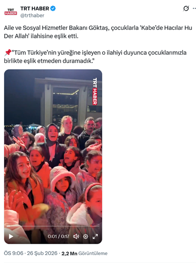 3. AKP’li Aile ve Sosyal Hizmetler Bakanı Mahinur Özdemir Göktaş, Batman programı kapsamında Atatürk Parkı'nda kurulan AKP Gençlik Kolları'na ait gençlik çadırını ziyaret ederek “Kabe'de Hacılar Hu Der” ilahisini söyledi. Görüntüler TRT’den yayınlandı. (26 Şubat)