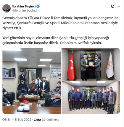1. AKP’li Cumhurbaşkanı R.T. Erdoğan’ın oğlu Bilal Erdoğan’ın yöneticilerinden olduğu TÜGVA’nın Düzce il temsilcisi İsa Yazıcı, Şanlıurfa Gençlik ve Spor İl Müdürü olarak atandı. Vakfın genel başkanı İbrahim Beşinci sosyal medya hesabından yaptığı paylaşımda “Geçmiş dönem TÜGVA Düzce İl Temsilcimiz, kıymetli yol arkadaşımız İsa Yazıcı’yı, Şanlıurfa Gençlik ve Spor İl Müdürü olarak atanması vesilesiyle ziyaret ettik. Yeni görevinin hayırlı olmasını diler, Şanlıurfa gençliği için yapacağı çalışmalarda üstün başarılar dileriz. Rabbim muvaffak eylesin.” dedi. TÜGVA’nın eski genel başkanı Enes Eminoğlu, 22 Haziran 2023 tarihli atama kararı ile Gençlik ve Spor Bakan Yardımcısı olmuştu. (8 Şubat)