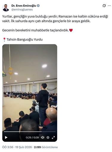 2. Gençlik ve Spor Bakan Yardımcısı ve AKP’li Cumhurbaşkanı R.T. Erdoğan’ın oğlu Bilal Erdoğan’ın yüksek istişare kurulu üyesi olduğu TÜGVA’nın eski genel başkanı Enes Eminoğlu sosyal medya hesabından yaptığı paylaşımda, Ankara Tahsin Banguoğlu Kredi ve Yurtlar Kurumu Yurdu sahur ziyaretini paylaştı. Eminoğlu paylaşımında “Yurtlar, gençliğin yuva bulduğu yerdir; Ramazan ise kalbin sükûna erdiği vakit. İlk sahurda aynı çatı altında gençlerle bir araya geldik. Gecenin bereketini muhabbetle taçlandırdık.” dedi. (19 Şubat)