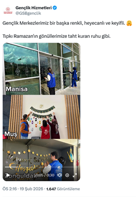 3. Gençlik ve Spor Bakanlığı, Gençlik Hizmetleri Genel Müdürlüğü’nün resmi sosyal medya hesabından farklı illerdeki gençlik merkezlerinde yapılan Ramazan hazırlıkları paylaşıldı. “Gençlik Merkezlerimiz bir başka renkli, heyecanlı ve keyifli. Tıpkı Ramazan'ın gönüllerimize taht kuran ruhu gibi.” ifadeleriyle birlikte farklı illerin yer aldığı video paylaşıldı. (19 Şubat)
