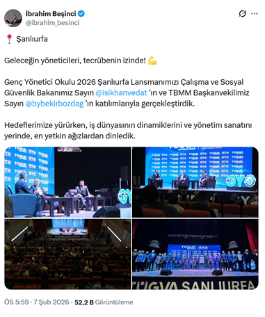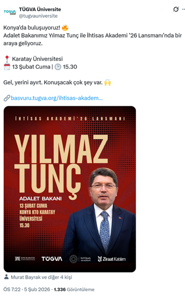 1. AKP’li Cumhurbaşkanı R.T. Erdoğan’ın oğlu Bilal Erdoğan’ın yüksek istişare kurulu başkanı olduğu TÜGVA’nın üniversiteler sosyal medya hesabından yapılan paylaşımda AKP’li Adalet Bakanı Yılmaz Tunç’un vakfın Konya Karatay Üniversitesinde düzenlediği “İhtisas Akademi ’26” programına katılacağı duyuruldu. (5 Şubat)