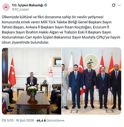 2. AKP’li İçişleri Bakanı Mustafa Çiftçi, en büyük gerici ayaklanmalardan biri olarak, ABD 6. Filosunun Türkiye’ye gelişini protesto eden antiemperyalistlere saldırıyı olan “Kanlı Pazar” düzenleyen geçen Milli Türk Talebe Birliği’nin (MTTB) genel başkanı ve heyetini makamında kabul etti. Ziyaret İçişleri Bakanlığı’nın resmi sosyal medya hesabından “Ülkemizde kültürel ve fikri donanıma sahip bir neslin yetişmesi konusunda emek veren Milli Türk Talebe Birliği Genel Başkanı Sayın Tahsin Başarı, Ankara İl Başkanı Sayın İhsan Koçdoğan, Erzurum İl Başkanı Sayın İbrahim Hakkı Algan ve Trabzon Eski İl Başkanı Sayın Abdurrahman Can Aydın İçişleri Bakanımız Sayın Mustafa Çiftçi'ye hayırlı olsun ziyaretinde bulundular.” İfadeleri ve fotoğraflarla paylaşıldı. (16 Şubat)