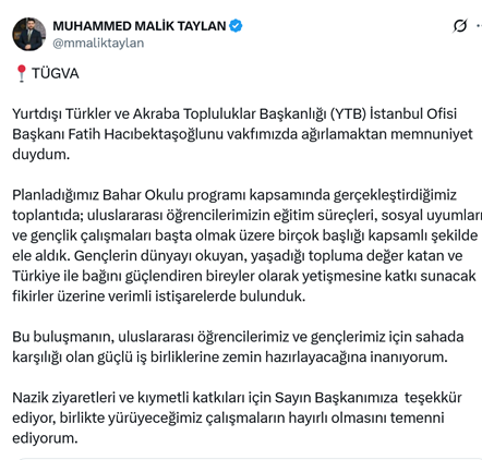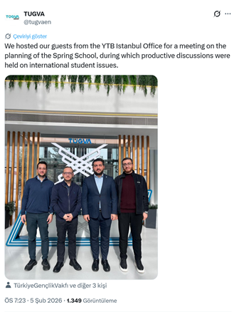 1. Yurtdışı Türkler ve Akraba Topluluklar Başkanlığı (YTB) İstanbul Ofisi Başkanı Fatih Hacıbektaşoğlu, AKP’li Cumhurbaşkanı R.T. Erdoğan’ın oğlu Bilal Erdoğan’ın yüksek istişare kurulu üyesi olduğu TÜGVA’nın İstanbul temsilciliğini ziyaret etti. TÜGVA’nın genel başkan yardımıcısı ve dış ilişkiler koordinatörü ünvanlı Muhammed Malik Taylan sosyal medya hesabından ziyaretle ilgili yaptığı paylaşımda “Yurtdışı Türkler ve Akraba Topluluklar Başkanlığı (YTB) İstanbul Ofisi Başkanı Fatih Hacıbektaşoğlunu vakfımızda ağırlamaktan memnuniyet duydum. Planladığımız Bahar Okulu programı kapsamında gerçekleştirdiğimiz toplantıda; uluslararası öğrencilerimizin eğitim süreçleri, sosyal uyumları ve gençlik çalışmaları başta olmak üzere birçok başlığı kapsamlı şekilde ele aldık. Gençlerin dünyayı okuyan, yaşadığı topluma değer katan ve Türkiye ile bağını güçlendiren bireyler olarak yetişmesine katkı sunacak fikirler üzerine verimli istişarelerde bulunduk.” dedi. (5 Şubat)