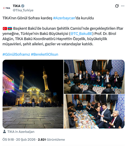 3. Türk İşbirliği ve Koordinasyon Ajansı Başkanlığı’nın (TİKA) resmi sosyal medya hesabından yaptığı paylaşımda, Azerbaycan’ın Başkenti Bakü’deki bulunan Şehitlik Camisi’nde düzenlenen iftar yemeği organizasyonu paylşaıldı. Paylaşımda “TİKA’nın Gönül Sofrası kardeş #Azerbaycan'da kuruldu. Başkent Bakü’de bulunan Şehitlik Camisi’nde gerçekleştirilen iftar yemeğine, Türkiye’nin Bakü Büyükelçisi Prof. Dr. Birol Akgün, TİKA Bakü Koordinatörü Hayrettin Özçelik, büyükelçilik müşavirleri, şehit aileleri, gaziler ve vatandaşlar katıldı.” Ifadeleri ile fotoğraflar yer aldı. (20 Şubat)