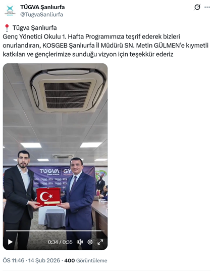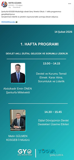 1. Küçük ve Orta Ölçekli İşletmeleri Geliştirme ve Destekleme İdaresi Başkanlığı (KOSGEB) Şanlıurfa İl Müdürü Metin Gülmen, AKP’li Cumhurbaşkanı R.T. Erdoğan’ın oğlu Bilal Erdoğan’ın yüksek istişare kurulu üyesi olduğu TÜGVA’nın Şanlıurfa “Genç Yönetici Okulu 1. Hafta Programı”na katılarak konuşma yaptı. (14 Şubat)