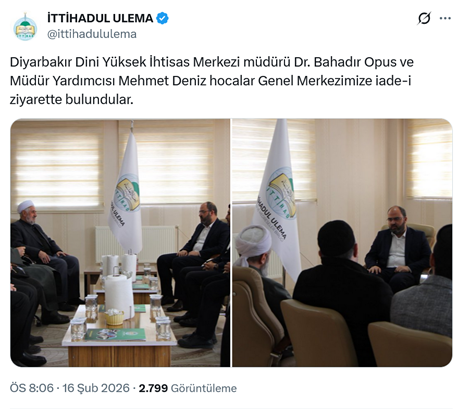 4. Diyanet Akademisi Başkanlığı Diyarbakır Dini Yüksek İhtisas Merkezi Müdürü Bahadır Opus, Türkiye’de Hizbullah adıyla faaliyet yürüten islamcı terör örgütünün medrese yapılanması olan İttihadululema’yı ziyaret etti. Opus, başkan yardımcısı Mehmet Deniz ile birlikte İttihadululema’nın genel başkan yardımcısı Abdulkudüs Yalçın’ın başkanlık ettiği heyetle görüştü. Ziyaret, İttihadululema isimli yapılanmanın sosyal medya hesabından “Diyarbakır Dini Yüksek İhtisas Merkezi müdürü Dr. Bahadır Opus ve Müdür Yardımcısı Mehmet Deniz hocalar Genel Merkezimize iade-i ziyarette bulundular.” Ifadeleri ve fotoğraflarla paylaşıldı. Mardin Artuklu Üniversitesi, Medrese Âlimleri Vakfı (MEDAV), Diyarbakır İl Müftülüğü, Diyarbakır Dini Yüksek İhtisas Merkezi ve Kadim Akademi'nin birlikte düzenlediği “Uluslararası II. Akademi-Medrese Buluşmaları: Medresenin Geleceği Çalıştayı”na 2024 yılı Aralık ayı Laiklik İhlalleri Raporunda yer verilmiş, LAiklik Meclisi üyesi Avukat İsmail Sami Çakmak medrese çalıştayına katılan Diyarbakır İl Müftüsü Celal Büyük, Mardin Artuklu Üniversitesi Rektörü Prof. Dr. İbrahim Özcoşar, Dicle Üniversitesi Rektörü Prof. Dr. Kamuran Eronat ve Medrese Âlimleri Vakfı (MEDAV) Başkanı Tayyip Elçi hakkında anayasaya karşı eylem gerçekleştirmek suçundan 18 Aralık 2024’te Diyarbakır Cumhuriyet Başsavcılığı’na suç duyurusunda bulunmuştu. Diyarbakır Cumhuriyet Başsavcılığı ise Mart 2025’te çalıştayın “medreselerin ilerideki pratiği üzerine düşünsel bir istişare” olarak nitelendirerek, çalıştayda herhangi bir suç ve suç unsuru barındırmadığına karar vermişti. (16 Şubat)