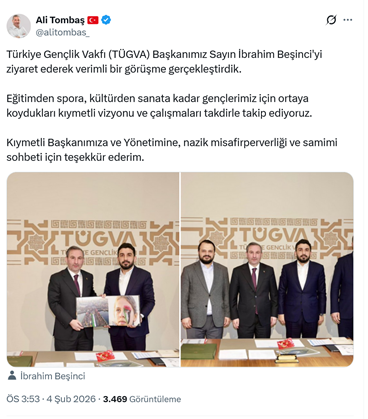 1. AKP’li İstanbul Sultanbeyli Belediye Başkanı Ali Tombaş, AKP’li Cumhurbaşkanı R.T. Erdoğan’ın oğlu Bilal Erdoğan’ın yüksek istişare kurulu başkanı olduğu TÜGVA’nın genel başkanı İbrahim Beşinci’yi ziyaret ettiğini “Türkiye Gençlik Vakfı (TÜGVA) Başkanımız Sayın İbrahim Beşinci'yi ziyaret ederek verimli bir görüşme gerçekleştirdik. Eğitimden spora, kültürden sanata kadar gençlerimiz için ortaya koydukları kıymetli vizyonu ve çalışmaları takdirle takip ediyoruz. Kıymetli Başkanımıza ve Yönetimine, nazik misafirperverliği ve samimi sohbeti için teşekkür ederim.” ifadeleriyle paylaştı. (4 Şubat)