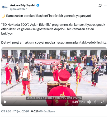 3. CHP’li Ankara Büyükşehir Belediyesi, Başkentin farklı noktalarında “50 Noktada 500’ü Aşkın Etkinlik” bağlığıyla ramazan etkinlikleri düzenlediğini duyurdu. ABB’nin resmi sosyal medya hesabından yapılan paylaşımda “Ramazan’ın bereketi Başkent’in dört bir yanında yaşanıyor! “50 Noktada 500’ü Aşkın Etkinlik” programımızla; konser, tiyatro, çocuk etkinlikleri ve geleneksel gösterilerle dopdolu bir Ramazan sizleri bekliyor. Detaylı program akışını sosyal medya hesaplarımızdan takip edebilirsiniz.” dendi. (17 Şubat)