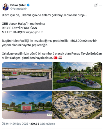 5. AKP’li Gaziantep Büyükşehir Belediyesi ile Halep Valiliği arasında “Halep Millet Bahçesi Parkı Yapımı ve Araç Hibesi Ortak Proje Protokolü” imzalandı. Halep valiliğinde imzalanan protokol kapsamında Halep şehir merkezinde 150 bin 692 metrekarelik alanda Millet Bahçesi yapılacak, 5 adet otobüs hibe edilecek. Protokole, Gaziantep Büyükşehir Belediye Başkanı Fatma Şahin, Halep Valisi Azzam Al Gharib ve Gaziantep Valisi Kemal Çeber katıldı. AKP’li Gaziantep Büyükşehir Belediye Başkanı Fatma Şahin, sosyal medya hesabından, “Bizim için de, ülkemiz için de anlamı çok büyük olan bir proje… GBB olarak Halep’in merkezine; RECEP TAYYİP ERDOĞAN MİLLET BAHÇESİ’ni yapıyoruz. Bugün Halep Valiliği ile imzaladığımız protokol ile, 150.600 m2 dev bir yaşam alanını hayata geçireceğiz. Ortak geleceğimizin güçlü bir sembolü olacak olan Recep Tayyip Erdoğan Millet Bahçesi şimdiden hayırlı olsun.” ifadeleriyle fotoğraflar paylaştı. (26 Şubat)
