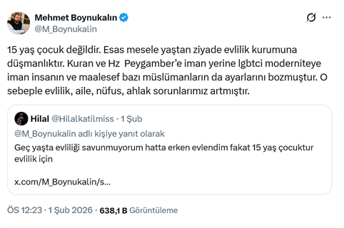 2. Marmara Üniversitesi İlahiyat Fakültesinde öğretim üyeliği yapan, eski Ayasofya camisi imamı Cumhuriyet, Atatürk ve laiklik düşmanı Mehmet Boynukalın, sosyal medya hesabından yaptığı paylaşımda “15 yaş çocuk değildir. Esas mesele yaştan ziyade evlilik kurumuna düşmanlıktır. Kuran ve Hz Peygamber’e iman yerine lgbtci moderniteye iman insanın ve maalesef bazı müslümanların da ayarlarını bozmuştur. O sebeple evlilik, aile, nüfus, ahlak sorunlarımız artmıştır.” ifadelerini kullandı. (1 Şubat)