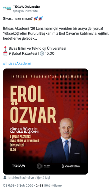 3. AKP’li Cumhurbaşkanı R.T. Erdoğan’ın oğlu Bilal Erdoğan’ın yüksek istişare kurulu başkanı olduğu TÜGVA’nın üniversiteler sosyal medya hesabından yapılan paylaşımda Yükseköğretim Kurulu (YÖK) Başkanı Erol Özvar’ın, vakfın Sivas Bilim ve Teknoloji Üniversitesinde düzenlediği “İhtisas Akademi ’26” programına katılacağı duyuruldu. Paylaşımda “Sivas, hazır mısın? İhtisas Akademi ’26 Lansmanı için yeniden bir araya geliyoruz! Yükseköğretim Kurulu Başkanımız Erol Özvar’ın katılımıyla; eğitim, hedefler ve gelecek…” ifadeleri yer aldı. (3 Şubat)