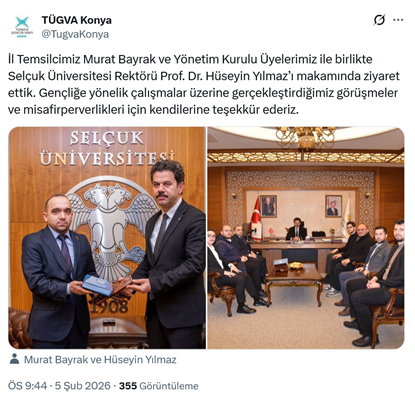 5. Selçuk Üniversitesi Rektörü Hüseyin Yılmaz, AKP’li Cumhurbaşkanı R.T. Erdoğan’ın oğlu Bilal Erdoğan’ın yüksek istişare kurulu başkanı olduğu TÜGVA’nın Konya il temsilcisi Murat Bayrak ve yönetim kurulu üyelerini makamında kabul etti. Vakfın Konya şubesi hesabından yapılan paylaşımda “İl Temsilcimiz Murat Bayrak ve Yönetim Kurulu Üyelerimiz ile birlikte Selçuk Üniversitesi Rektörü Prof. Dr. Hüseyin Yılmaz’ı makamında ziyaret ettik. Gençliğe yönelik çalışmalar üzerine gerçekleştirdiğimiz görüşmeler ve misafirperverlikleri için kendilerine teşekkür ederiz.” dendi. (5 Şubat)