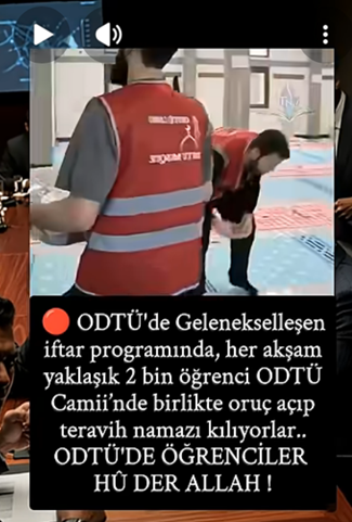 7. Sosyal medyada “ODTÜ'de öğrenciler Hû der Allah!” başlığıyla “ODTÜ'de Gelenekselleşen iftar programında, her akşam yaklaşık 2 bin öğrenci ODTÜ Camii’nde birlikte oruç açıp teravih namazı kılıyor!” ifadeleriyle iftar ve teravih programlarının görüntüleri paylaşıldı. (24 Şubat)