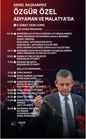11. CHP Genel Başkanı Özgür Özel Kahramanmaraş ve Hatay merkezli 6 Şubat depremlerinin yıldönümünde CHP’li Adıyaman Büyükeşhir Belediyesi tarafından düzenlenen Adıyaman’da depremde yaşamını yitirenler anısına Adıyaman Belediyesi ve İstanbul Büyükşehir Belediyesi işbirliğiyle yapılacak “Deprem Şehitliği” nin temel atma törenine katıldı ve depremlerde yaşamını yitiren yurttaşlar için mezarlık ziyaretinde bulundu. Temel atma töreni dualarla yapıldı, mezarlık ziyaretinde programda dualar yer aldı. (6 Şubat)