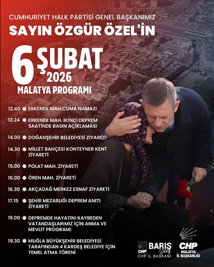 6. CHP Genel Başkanı Özgür Özel’in Kahramanmaraş ve Hatay merkezli 6 Şubat depremlerinin partisi tarafından yayınlanan programında Cuma namazı ve mevlit okunması yer aldı. (4 Şubat)