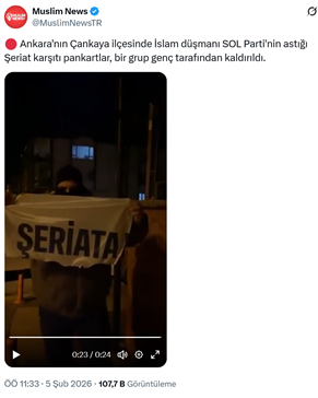 8. SOL Partinin Ankara Çankaya’da astığı “Şeriata karşı laik, devrimci, demokratik cumhuriyet” pankartın bir grup gerici tarafından indirildiği görüntüler “muslim news” adlı bir hesap tarafından paylaşıldı. Paylaşılan videoda konuşan kar maskeli bir şahıs “Bu aşağılık köpeklerin şeriata, Allaha, peygambere, kurala hakaret etme hakları yok. Gördüğümüz yerde, gördüğümüz zaman gerekeni sonunda yapacağız. Şanslarını çok zorluyorlar.” dedi. (5 Şubat)